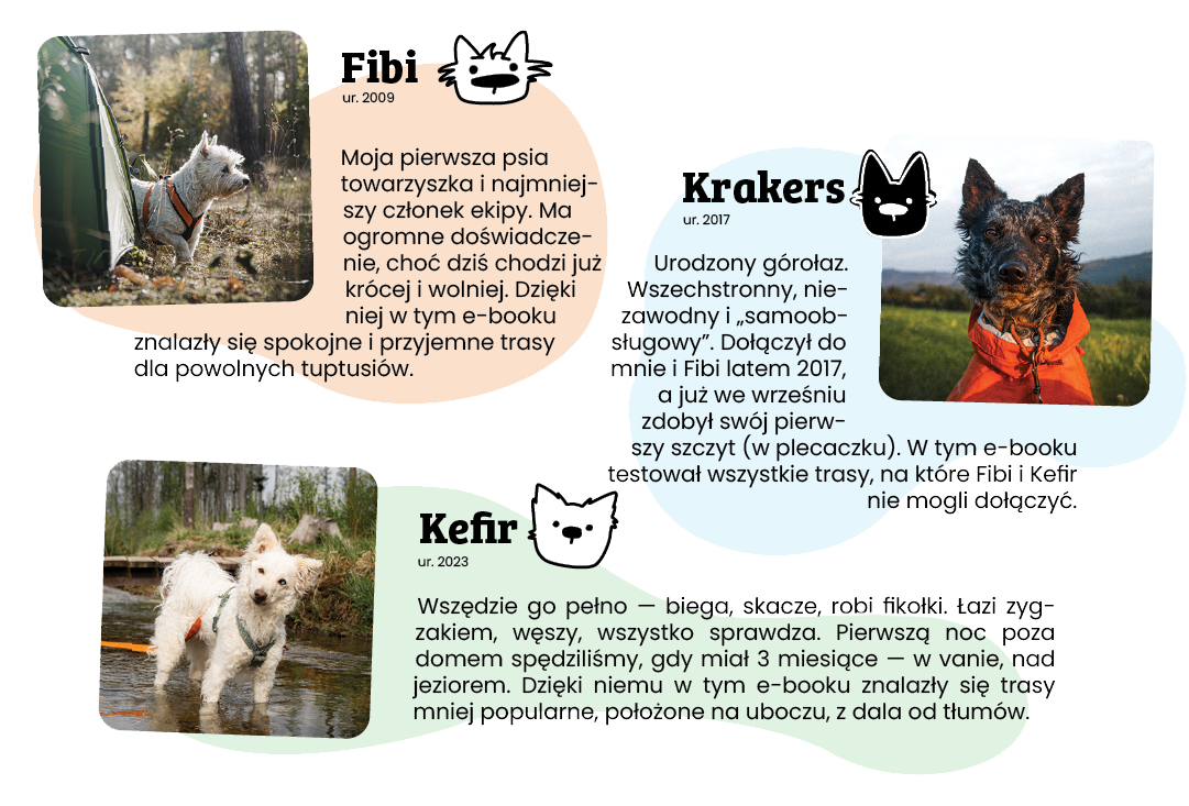 Psy są nieodłączną częścią tej przygody — to dzięki nim zaczęłam podróżować i to one nadają rytm moim wyprawom. Każdy z nich jest inny, dzięki czemu w przewodniku znalazł się pełen przekrój tras.