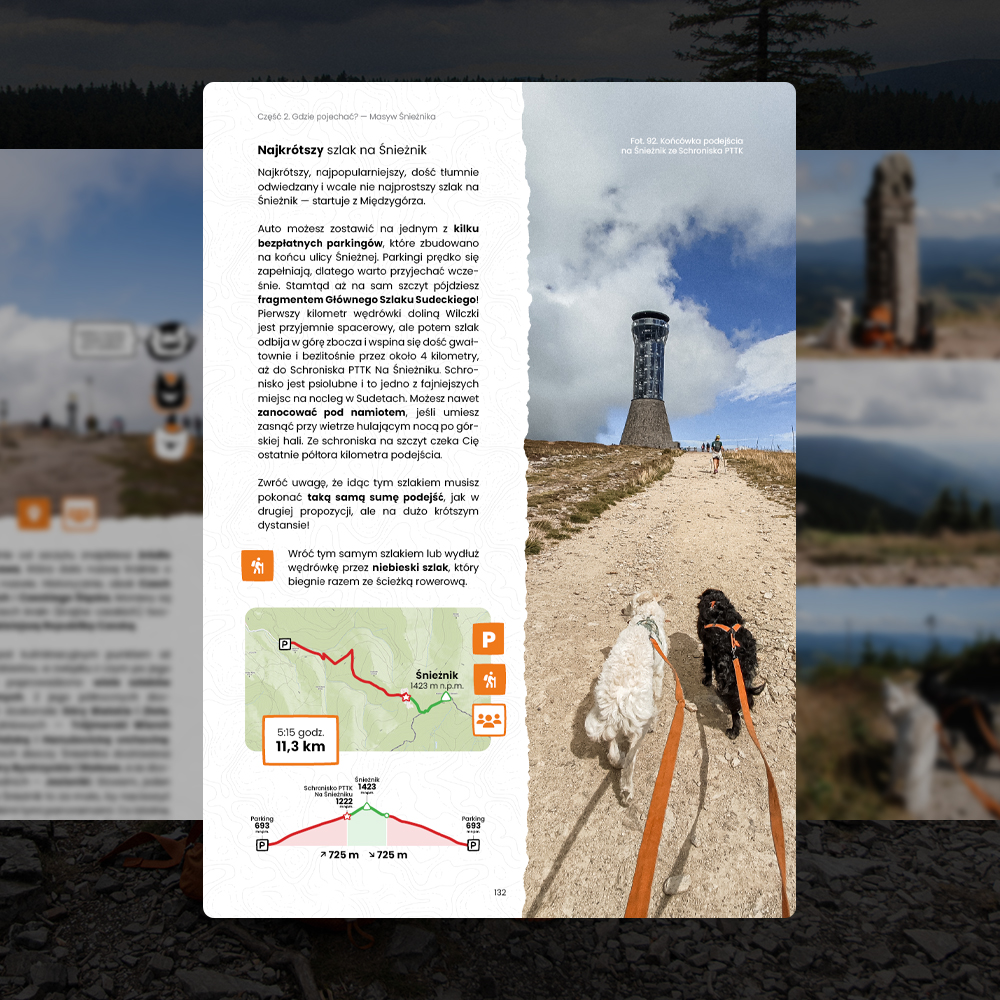 Każdy opisany szlak przeszłam z moimi psami i opisałam je jak psiarz dla psiarza. Od razu pokazuję Ci ilość kilometrów i profil trasy, a także czasy przejścia policzone spokojnym tempem. Wskazuję gdzie są trudniejsze podejścia albo popularniejsze punkty, gdzie nie wejdziesz z psem i na który szlak będziesz potrzebować paszportu. W środku znajdziesz zarówno krótkie trasy, wędrówki na cały dzień, jak i ich łatwiejsze/trudniejsze warianty.